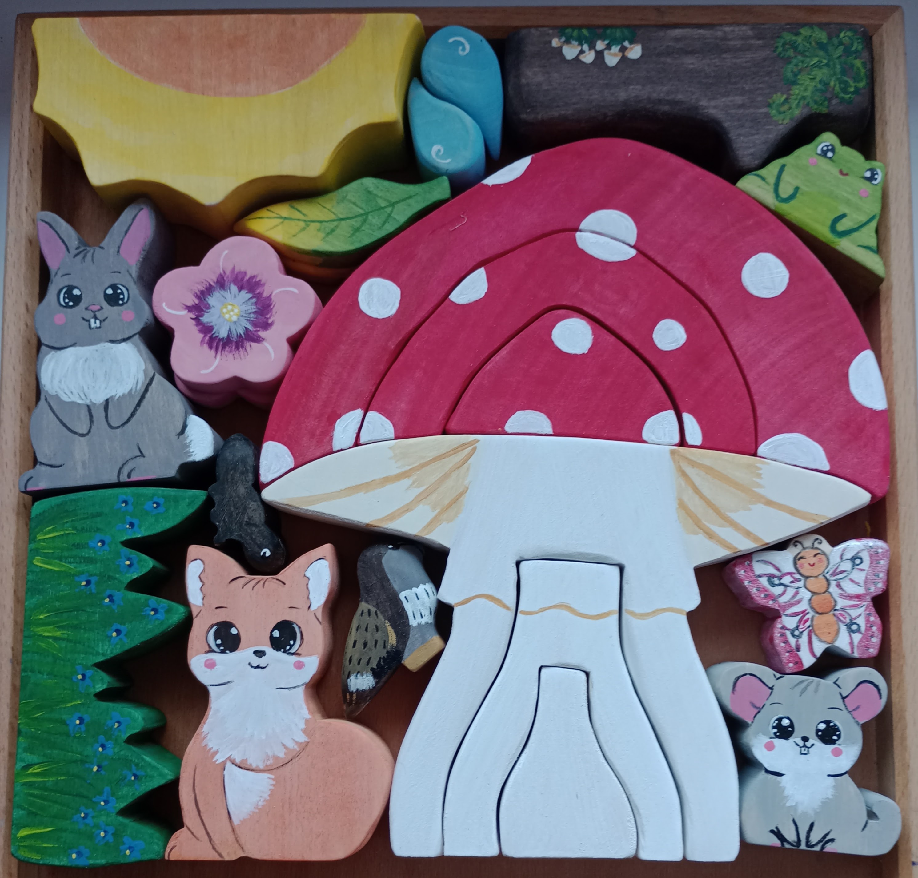 Kézzel készített,fából készült gomba kirakó, amely játékosan fejleszti a kézügyességet és a logikát, miközben a természet világát hozza közelebb a gyerekekhez.