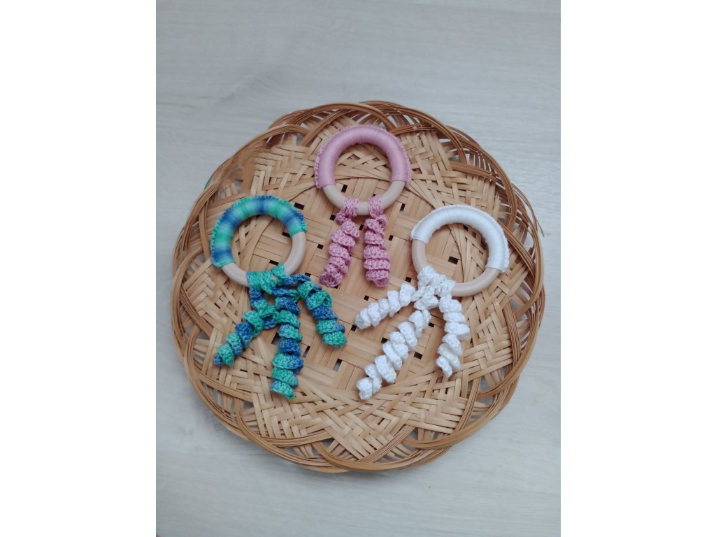 Egyedi, fa karikára horgolt rágóka játékos polipcsápokkal. Biztonságos, bababarát rágóka fogzás idejére, amely szórakoztatja a babát és fejleszti az érzékszerveit.