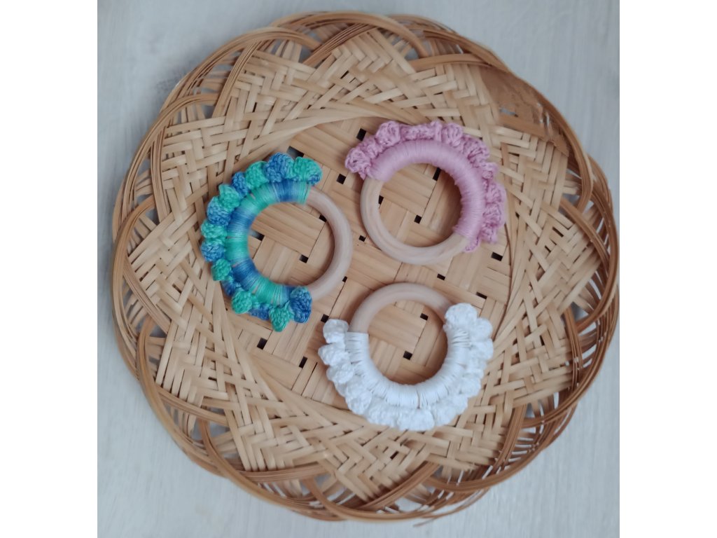 Ez a fa karikára horgolt rágóka természetes alapanyagokból készült, hogy biztonságos és praktikus segítség legyen a babának a fogzás idején. A sima, natúr fa karika kellemesen masszírozza az ínyt, a puha pamut horgolás pedig játékos tapintási élményt nyújt.