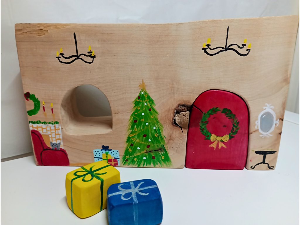 Kézzel készített, fából készült karácsonyi Mikulás ház, amely vidám szerepjátékhoz és ünnepi dekorációnak is tökéletes.