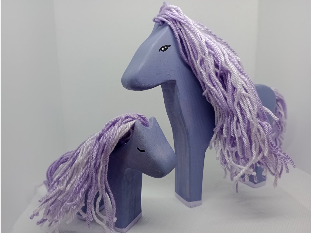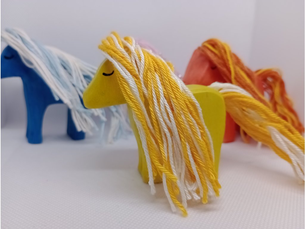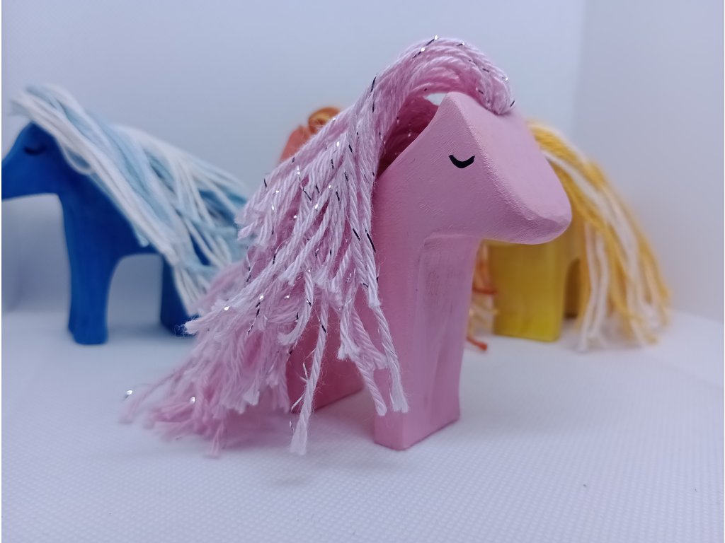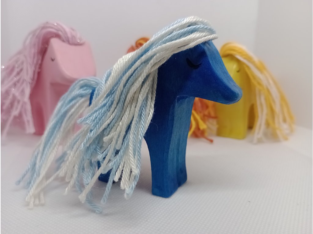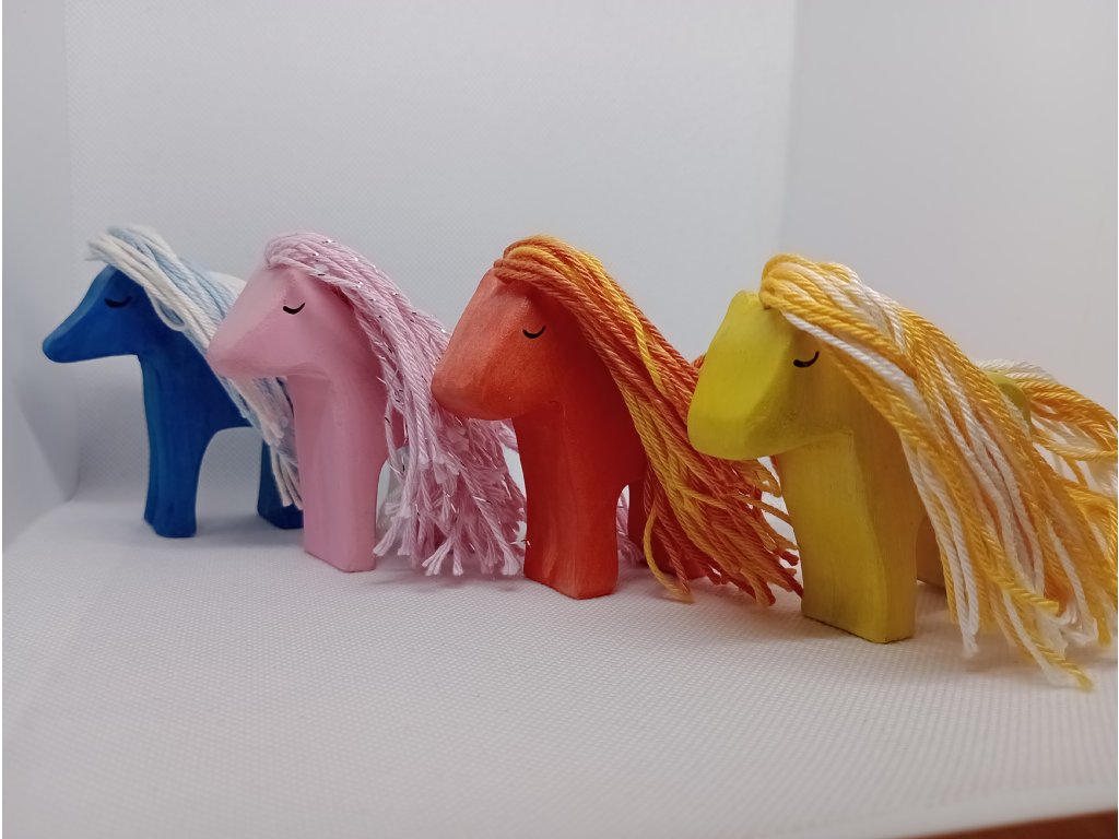 Kézzel készített, természetes fából faragott lovak és csikók, amelyek mesés szerepjátékhoz, gyűjteménybe és gyerekszoba dekorációnak is kiválóak.